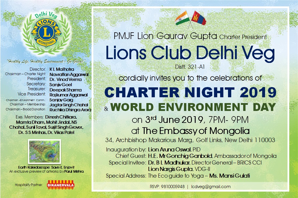 Lions Club Delhi Veg has wonderfully celebrated the Charter Night of the Club and World Environment Day on Monday, 3rd June, 2019 at Embassy of Mangolia New Delhi lion Aruna Oswal, PID inaugrated the function HE Gonchig Ganbold, Ambassador of Mangolia was the Chief Guest, Lion M L Arora, DG Elect 2019-20, Lion Nargish Gupta VDG-1, Lion Ashok Sharma, VDG-2, Lion Vijay Budhhiraja, PDG all Special Invites were present.