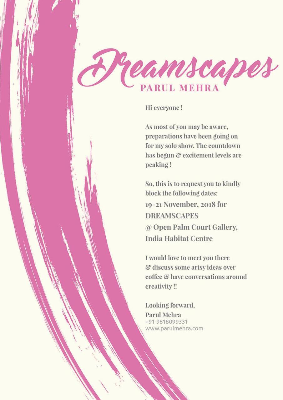 Dreamscapes Parul Mehra, Open Palm Court Gallery, India Habitat Centre, 19-21 Nov 2018Dreamscapes Parul Mehra, Open Palm Court Gallery, India Habitat Centre, 19-21 Nov 2018