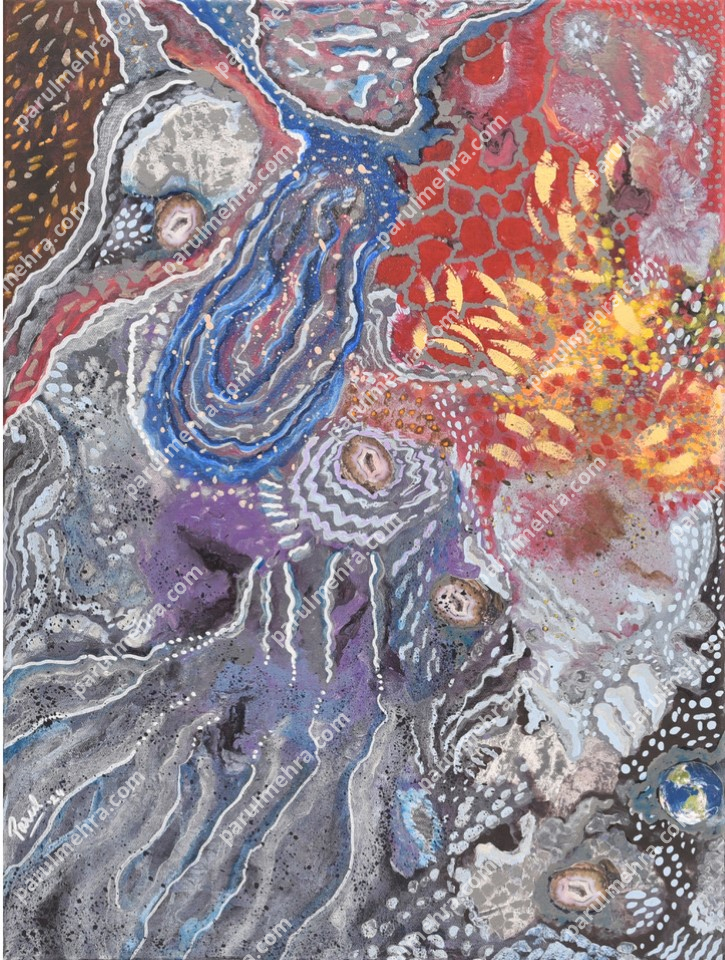 The artwork depicts creation of the universe with all it’s action. The earth , asteroids and floating objects play a part as pieces of a grand puzzle as a consequence of the Big Bang Theory.