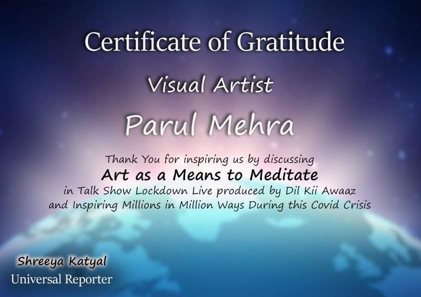 - Certificate of Gratitude to Visual Artist Parul Mehra in Talk Show Lockdown, June 2020Certificate of Gratitude to Visual Artist Parul Mehra in Talk Show Lockdown, June 2020