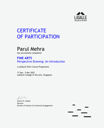 - Certificate of Participation, FINE ARTS, Mixed Media Painting: An Introduction, a LASALLE Short Course Programme, 02 OCT - 04 DEC 2021Certificate of Participation, FINE ARTS, Mixed Media Painting: An Introduction, a LASALLE Short Course Programme, 02 OCT - 04 DEC 2021