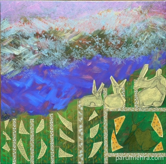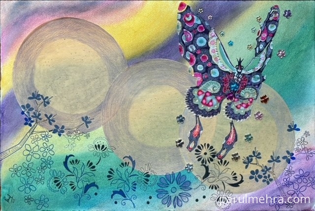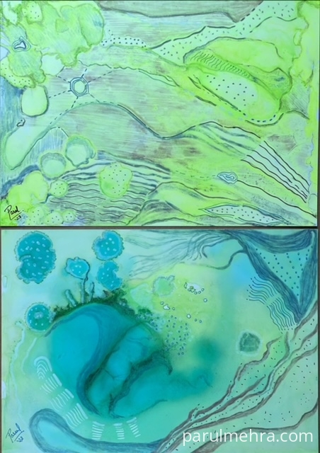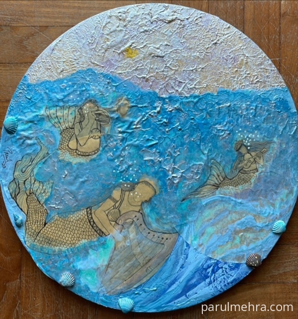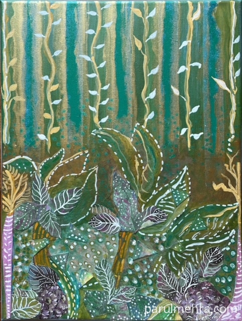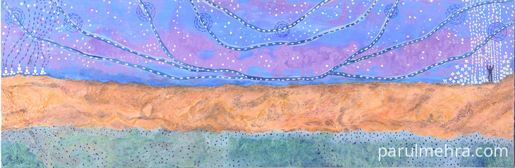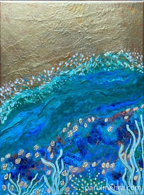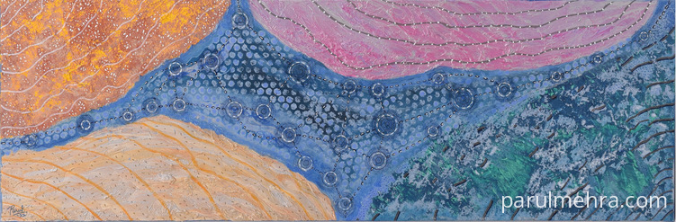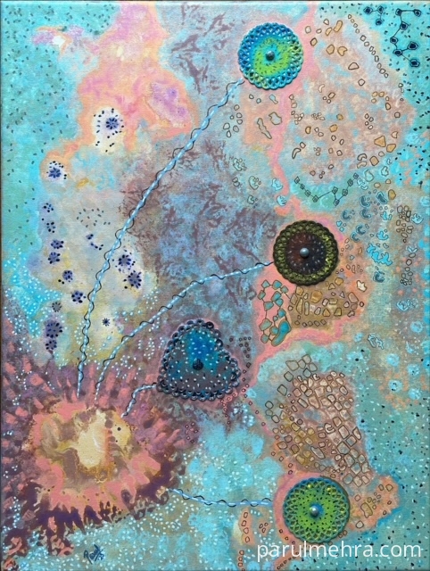 This artwork was part of “Making Waves" art show at Visual Arts Gallery , Singapore . This represents String theory of Physics & individuals resonating with these fundamental forces. The universe comprises of strings which vibrate & humans also vibrate at different wavelengths. Hence we can all tap into/ attune with higher vibrations by few actions such as contemplation in isolation / meditation / thinking positively & thus enhancing our current state of being. It’s a common belief that we attract what we think by sending out sublime messages to the universe. This mystical concept compelled me to explore deeper & as a spiritual artist these thoughts evoked an over whelming emotion in me .