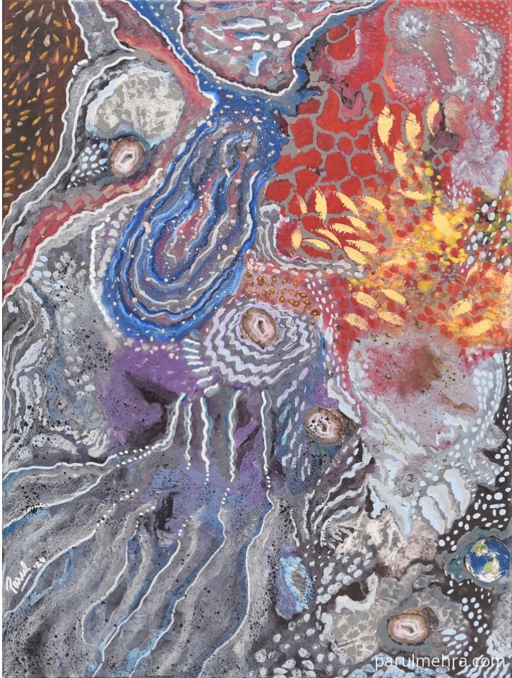 The artwork depicts creation of the universe with all it’s action. The earth , asteroids and floating objects play a part as pieces of a grand puzzle as a consequence of the Big Bang Theory.