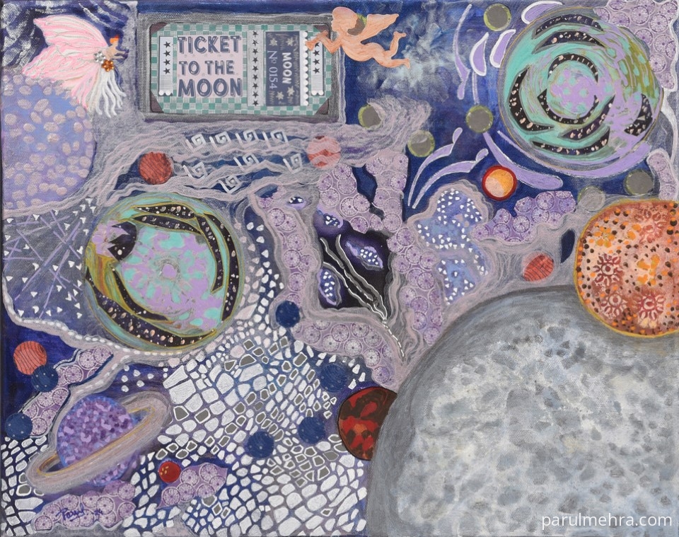 The fairy is attempting interstellar travel and grabbing her ticket to the moon . The cherub accompanies her as a travel mate and the whole universe is pristine & untouched with its cosmic energies.